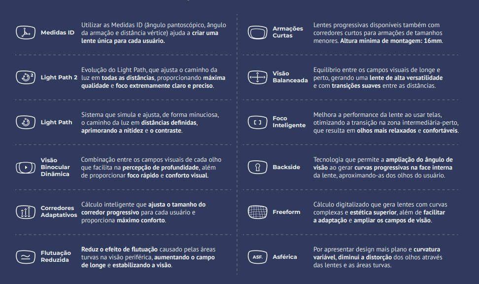 Com tecnologia de ponta, elas oferecem transições suaves entre perto, intermediário e longe, reduzindo o incômodo efeito de flutuação comum em lentes convencionais.